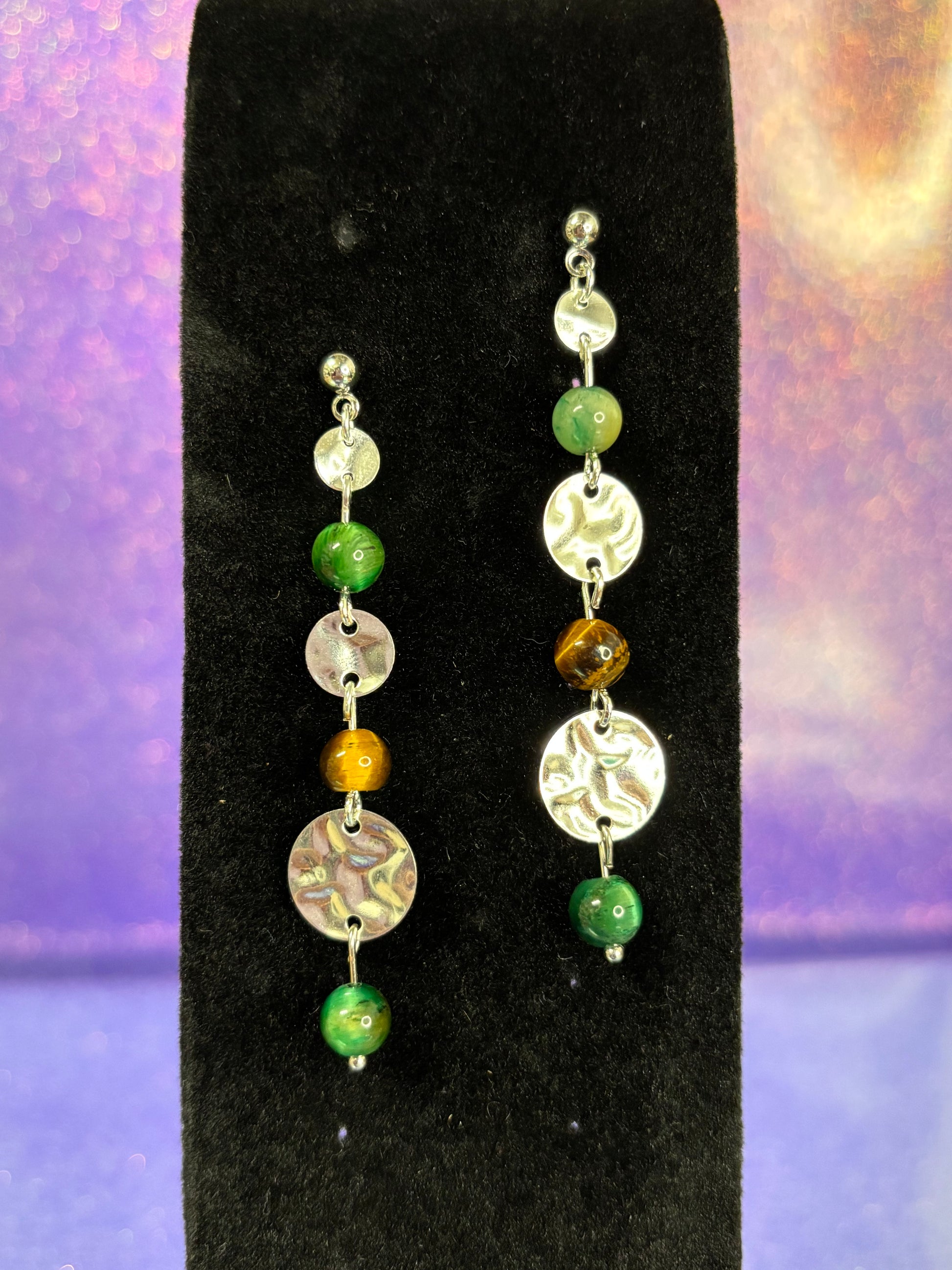 Green and natural Tiger Eye come together to create these beautiful earrings