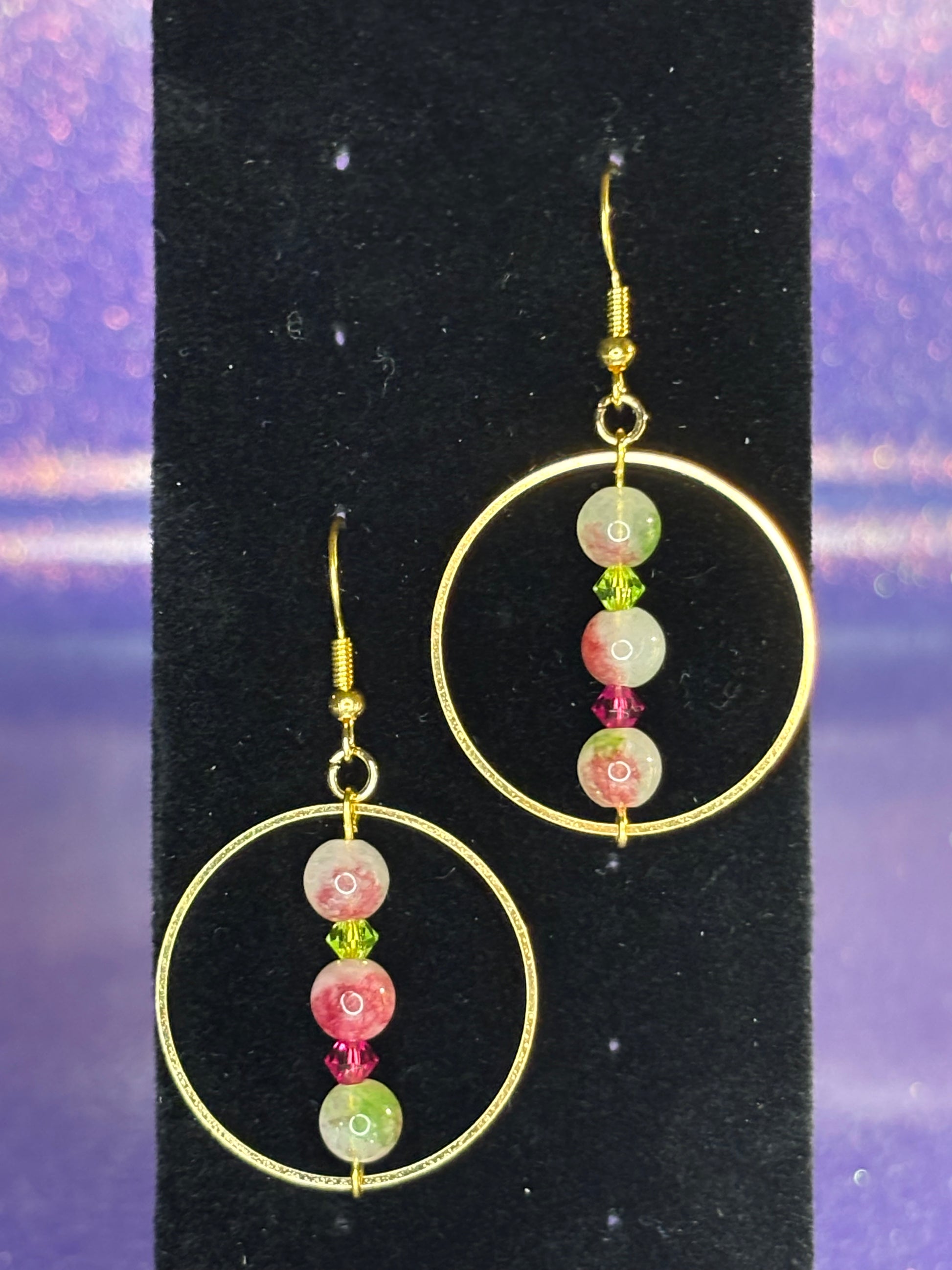 Watermelon Tourmaline with Green and dark pink crystals in a gold hoop